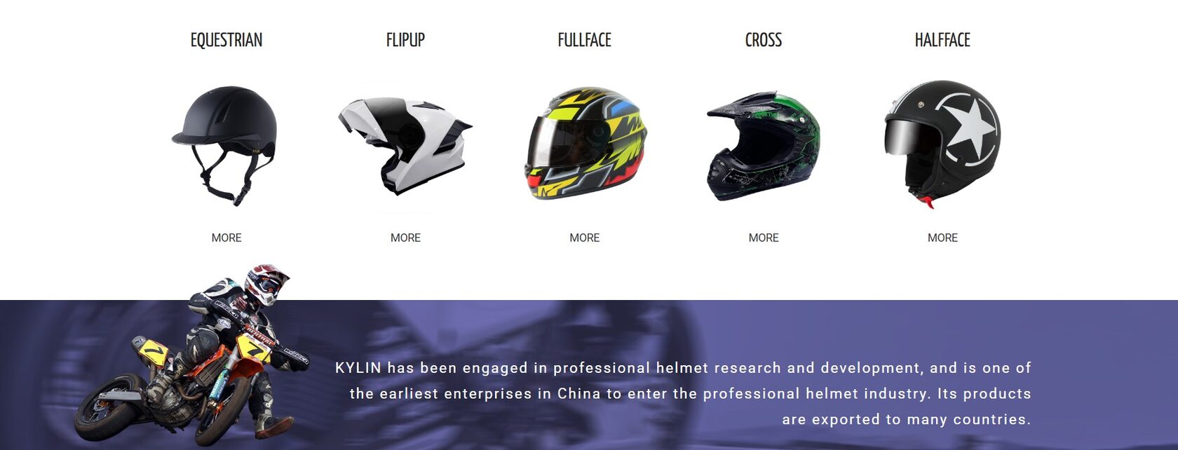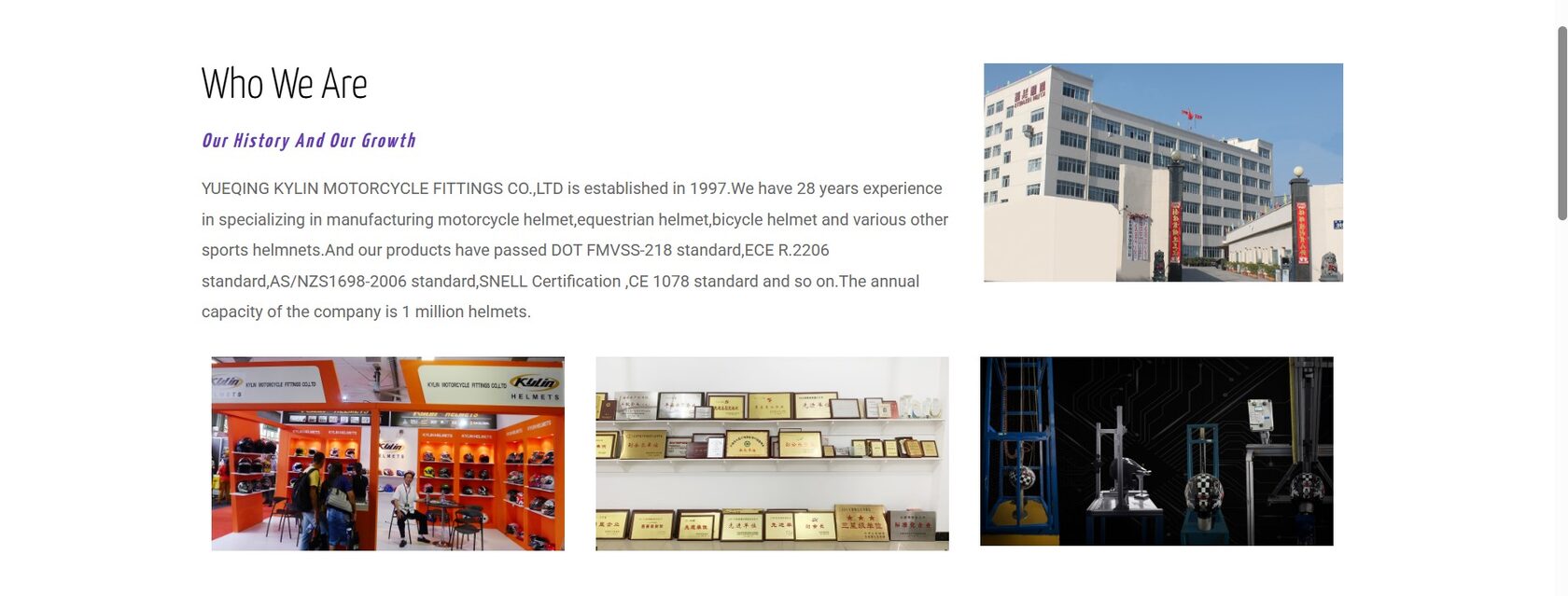 Компания YUEQING KYLIN MOTORCYCLE FITTINGS CO., LTD. была основана в 1997 году. Она обладает 29‑летним опытом работы и специализируется на производстве шлемов для мотоциклов, конного спорта, велосипедов, а также различных других спортивных шлемов.