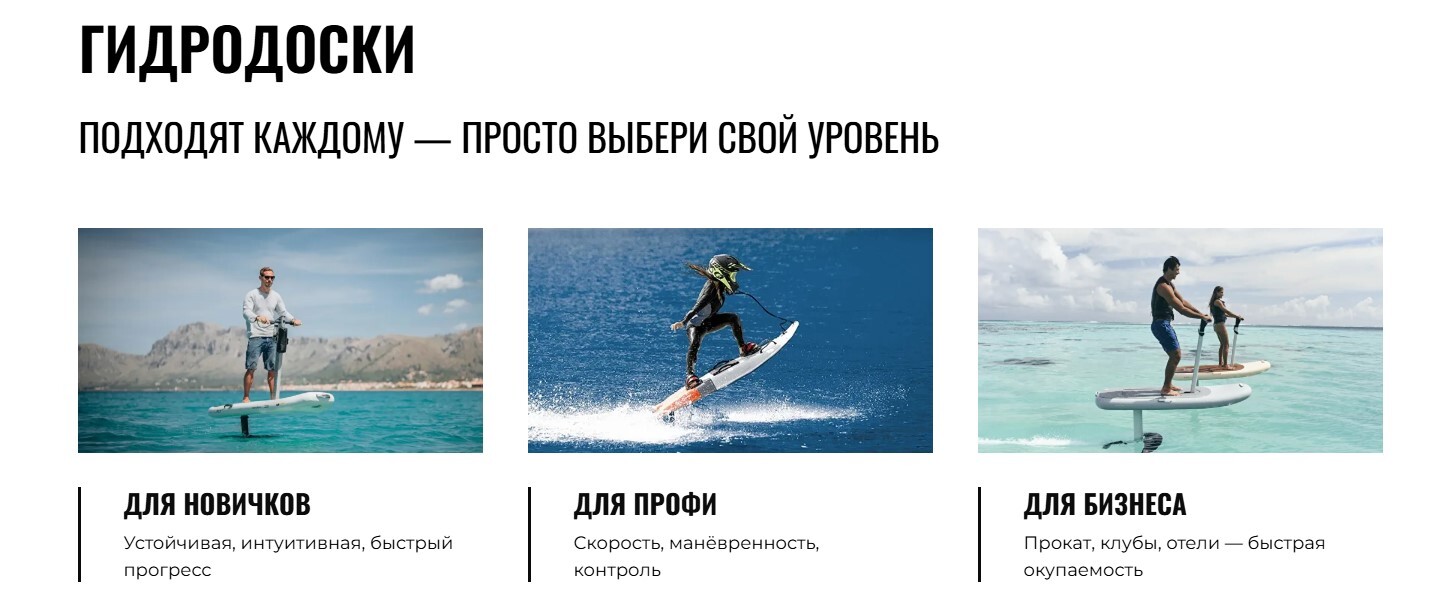 Гидродоски - лидер в сфере инновационного оборудования для активного отдыха на воде. Мы осуществляем оптовые поставки ведущих мировых брендов электросерфов, мотосерфов, электрофойлов и флайбордов (ABNC, Rush Wave, JetWave, DLE и др.) и сами производим профессиональные флайборды FlyBoots. В сфере обучения компания основала Федерацию водного спорта и собственную школу, проводит международный фестиваль Flyboard Weekend. Мы обеспечиваем полное обслуживание техники и сервисную поддержку. Наша профессиональная шоу-команда «Летающие Люди» организует зрелищные выступления на мероприятиях.