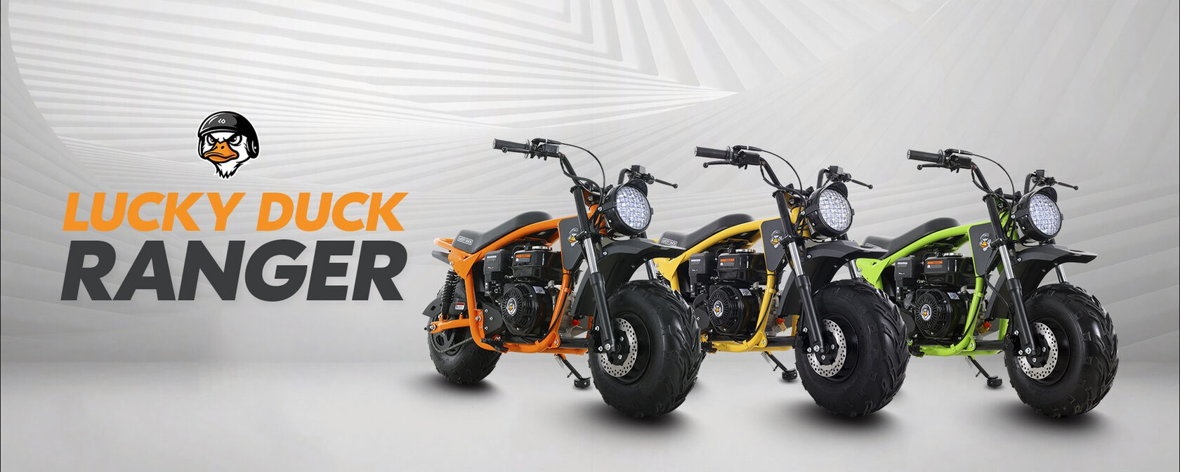 Бренд Lucky Duck отлично зарекомендовал себя на рынке с линейкой минибайков RANGER. Минибайки Lucky Duck – быстрое и комфортное средство передвижения по пересеченной местности, идеально подходящее как для опытных райдеров, так и для новичков. Простые по конструкции, а поэтому надежные, и не требующие сложного обслуживания. В ассортименте представлены две модели. Они оснащены двигателем 196см3, и шинами низкого давления. Основные различия моделей - в трансмиссии и уровне оснащения.